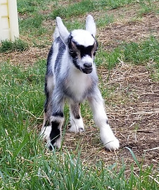 Ivy's buckling was born on 4/4/18 at 6:15 PM. He is a Tri-Color with blue eyes. His dam is disbudded , and the sire is horned.